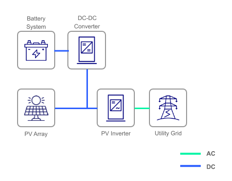The diagram below shows a simple single-line diagram of an DC coupled solar plus storage configuration.